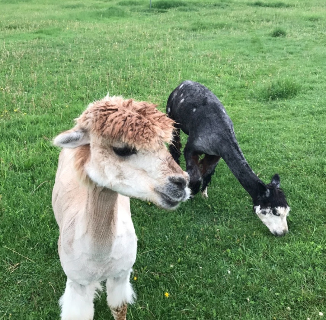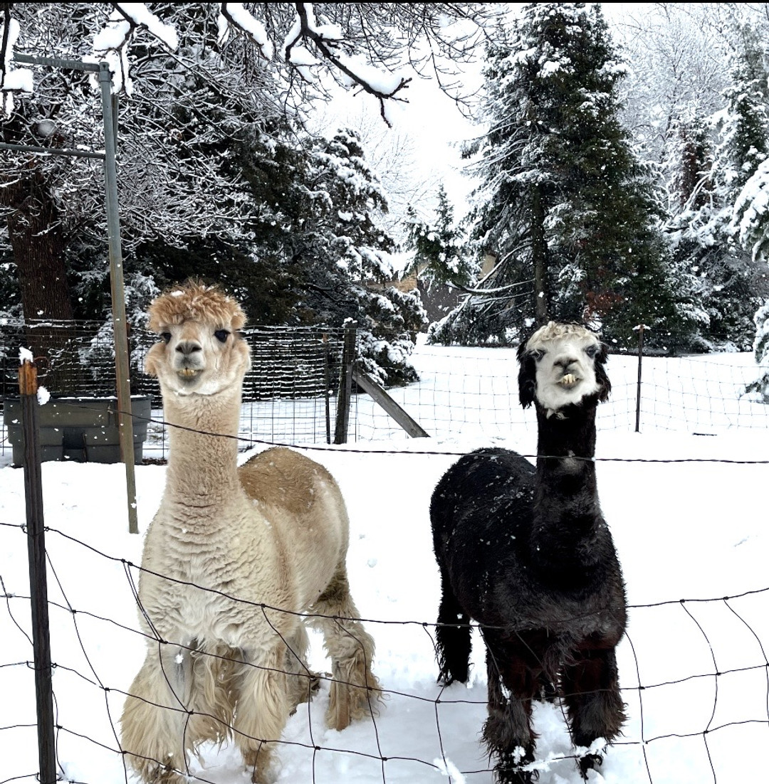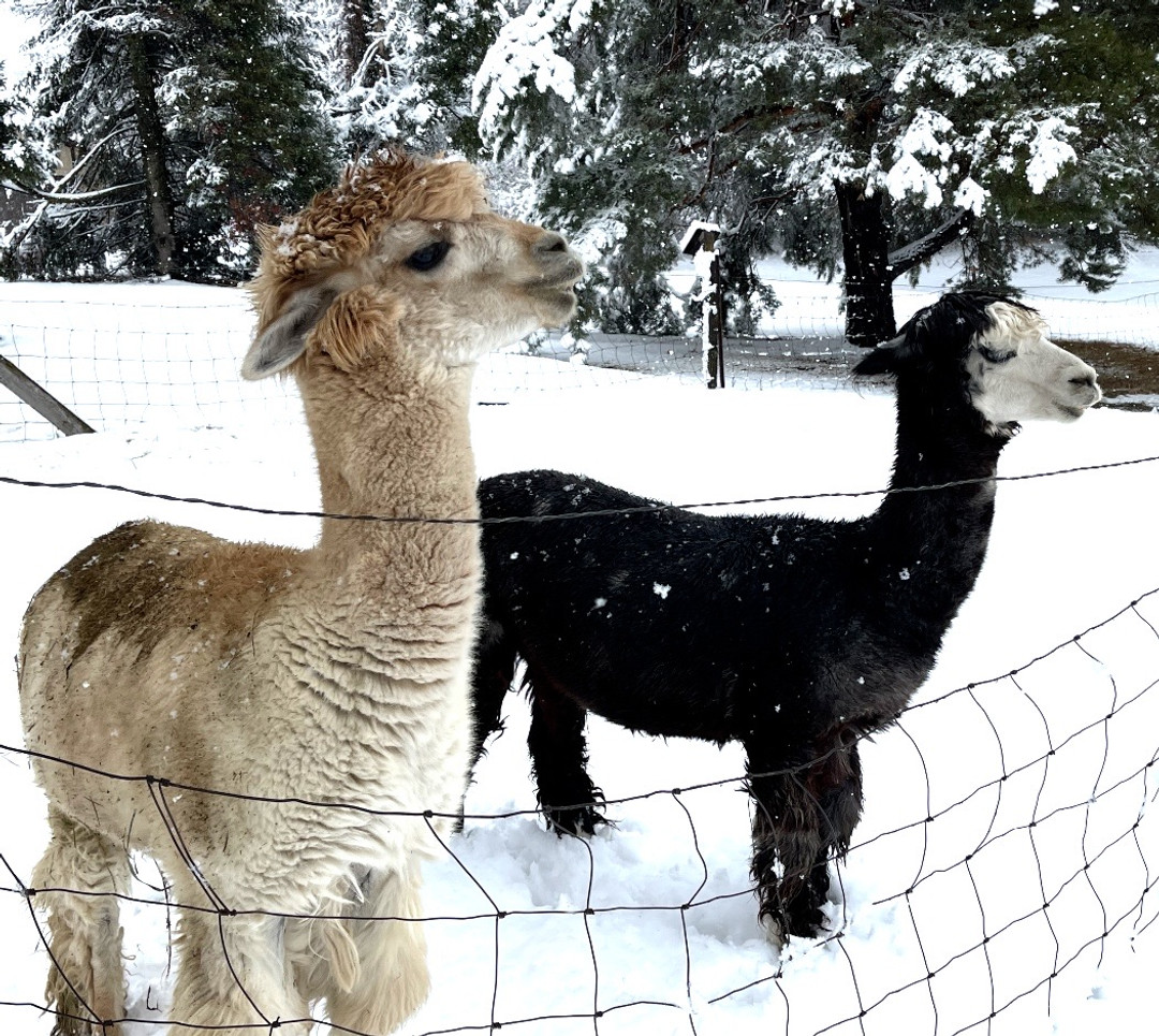 The 2 Alpacas we have been raising here since 2011 have really great wool for knitting. Their names are Rolex with silver black wool and T-Rex with the fawn colored wool. Alpaca wool has a hollow center in the fiber which makes it insulating in the cold and it also breathes well when it is hot. A lot of knitters really like this wool and have made 2-tone garments with it.