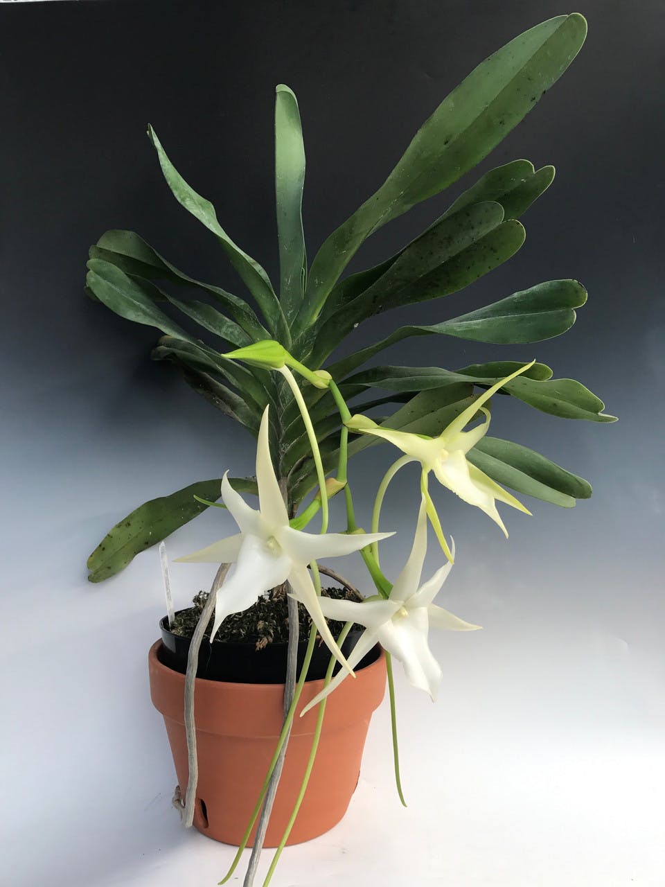 These orchids are commonly grown on slabs. If grown bare root, Angraecoids should be wetted or misted daily. If the leaves begin to shrivel, increase your watering frequency. For potted Angraecoids, or those mounted on sphagnum moss, plants should be watered once the media has dried entirely. This generally occurs every 7 days from the previous watering. If in doubt, do not water and wait another day or two. Remember that small plants in clay pots can dry out within a couple of days. Plants should never stand in water. Make sure to water more often when Angraecoids are about to bloom, and throughout the blooming period. When repotting your Angraecoids during the active growing season, do not water the media for at least 3 days. This allows cuts and breaks in the roots to callous and avoid rotting upon being watered. We always recommend watering in the morning, as this gives the leaves time to dry and avoid bacterial growth overnight. If possible, use water low in alkalinity, such as rainwater, distilled water, or reverse osmosis water. If you have a dehumidifier in your home, the water that collects in the tray is excellent for watering orchids.