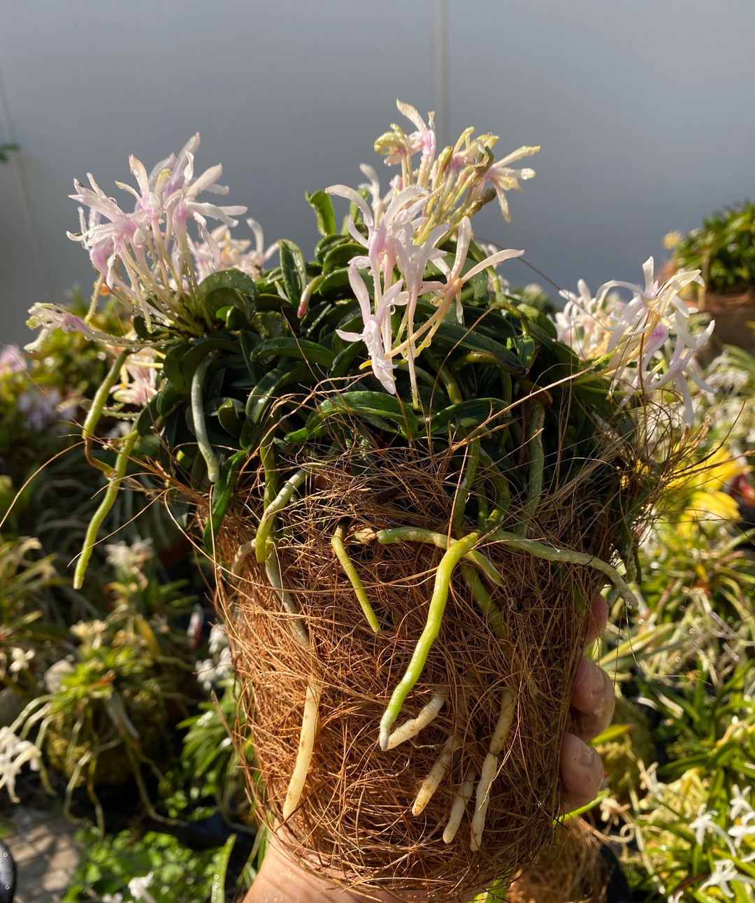 This is also the same material we use as another Neofinetia falcata potting material (you can see a picture of a large 'Seikai' variety after growing in the fiber for one year). If you have been using moss and want to try something that does not break down as fast, this is a good alternative. Know that it breathes more and will need more water than sphagnum moss. Coco fiber should last anywhere between 2 and 4 years on average, and most likely the plant will outgrow the pot before the coco fiber breaks down. Check on it once in a while for snow mold when in plastic. It sometimes forms near the drain holes but is easy to get rid of. It also works in clay pots as well, which will again require more water than when in plastic. All in all, experiment first, find a balance, and then switch over!