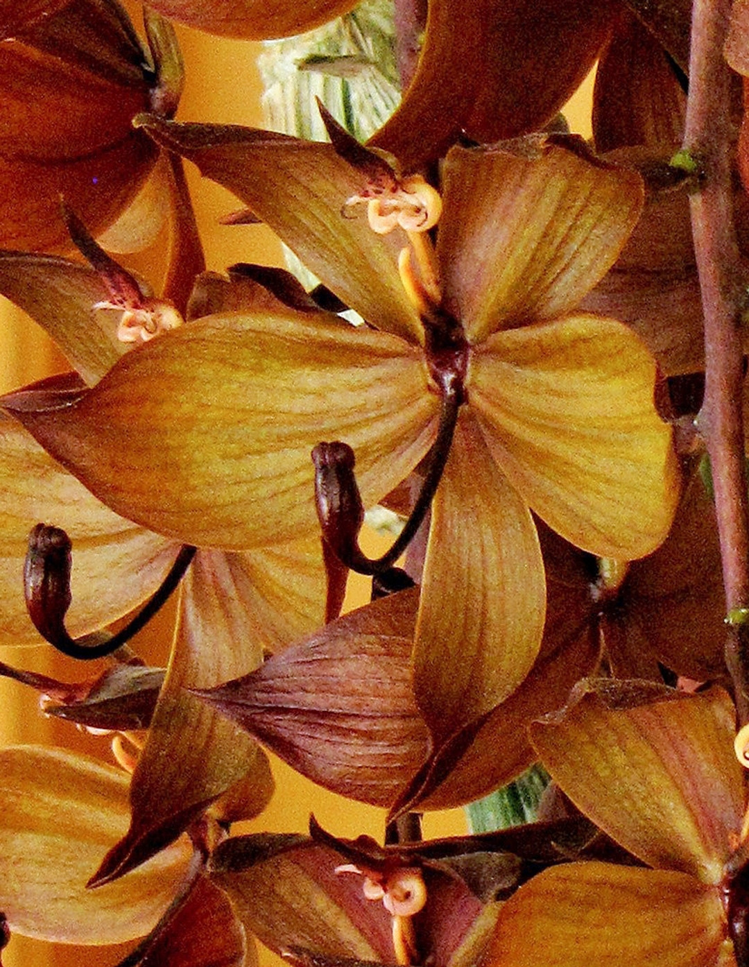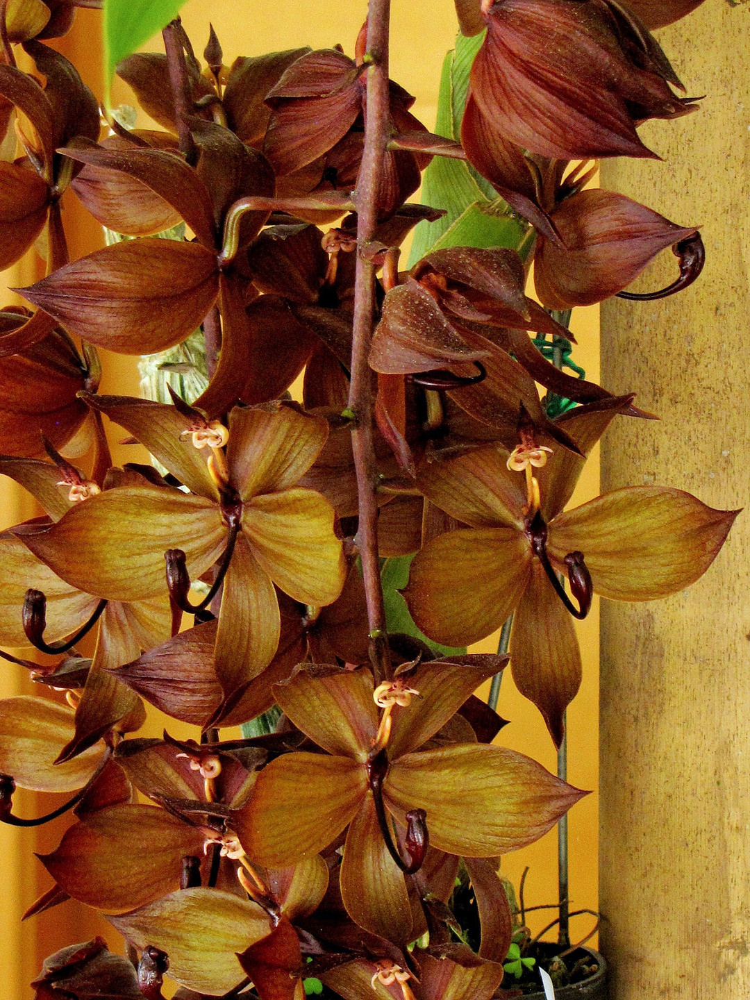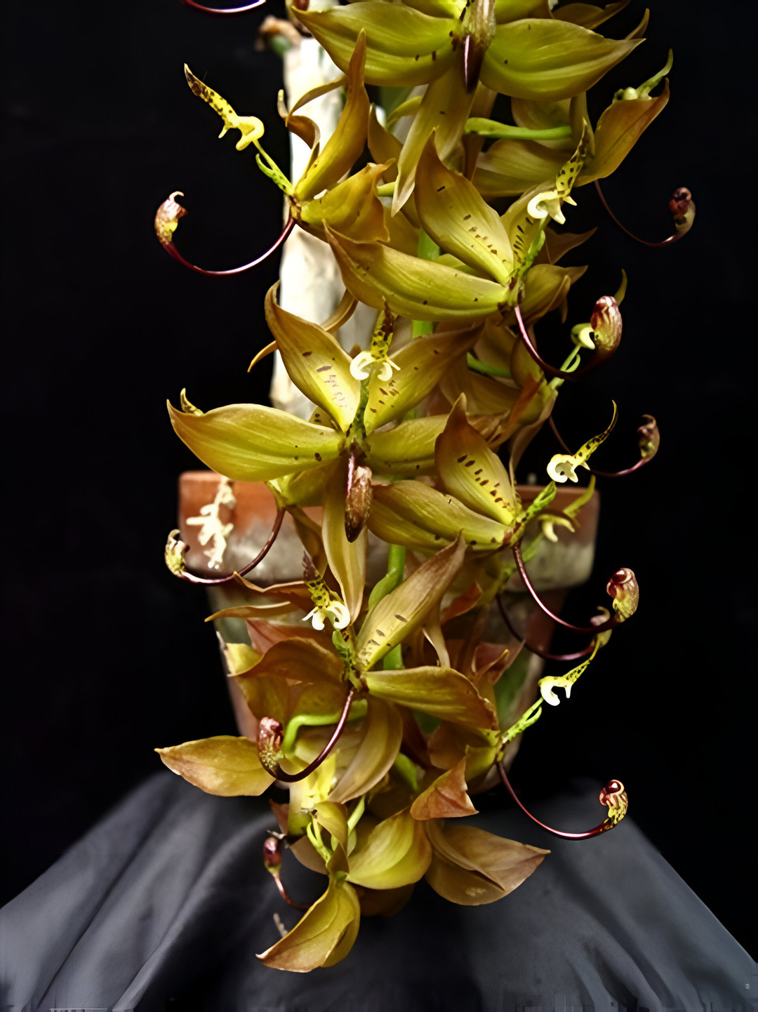 Cycnoches cooperi is a beautiful species native to northern Peru and Brazil. These plants can produce separate male or female flowers depending on light levels. Lower light produces the beautiful and more abundant male flowers as in the photos shown. Female flowers produced in high light will have shorter spikes with fewer, larger flowers.