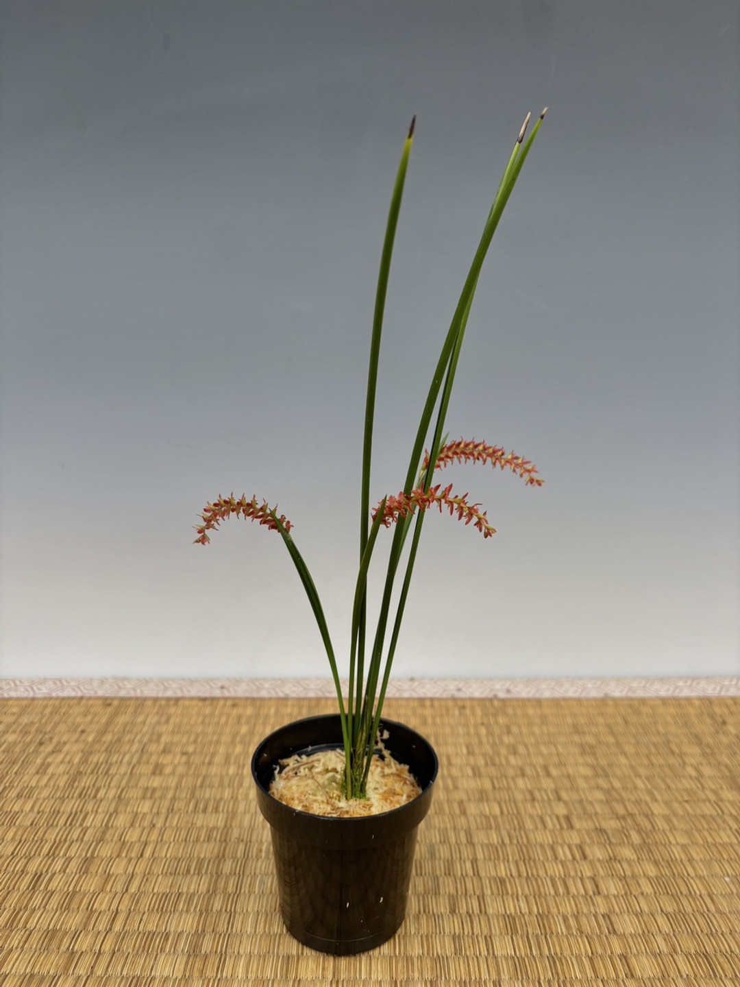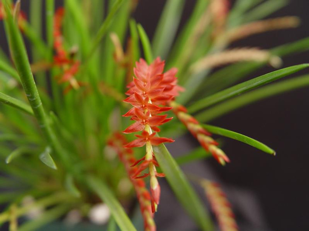 This is a fantastic miniature Dendrochilum species that has sharply pointed, grassy foliage and produces inflorescences that carry densely packed ranks of as many as 10-15 coppery, reddish-orange flowers on each side of the spike.