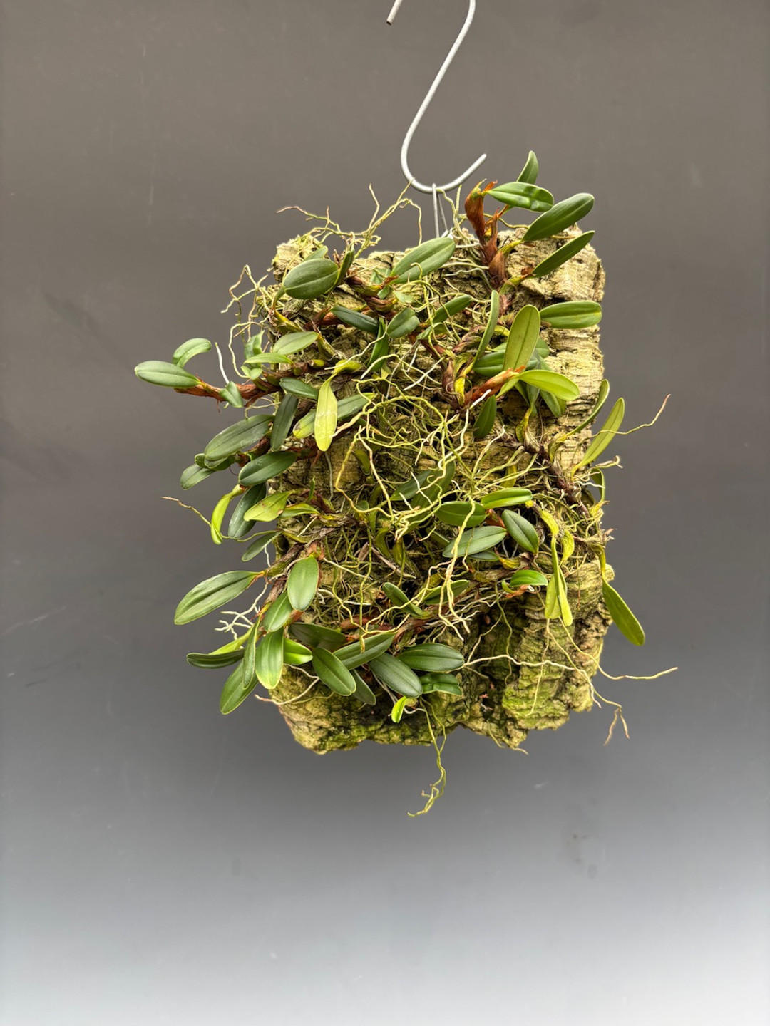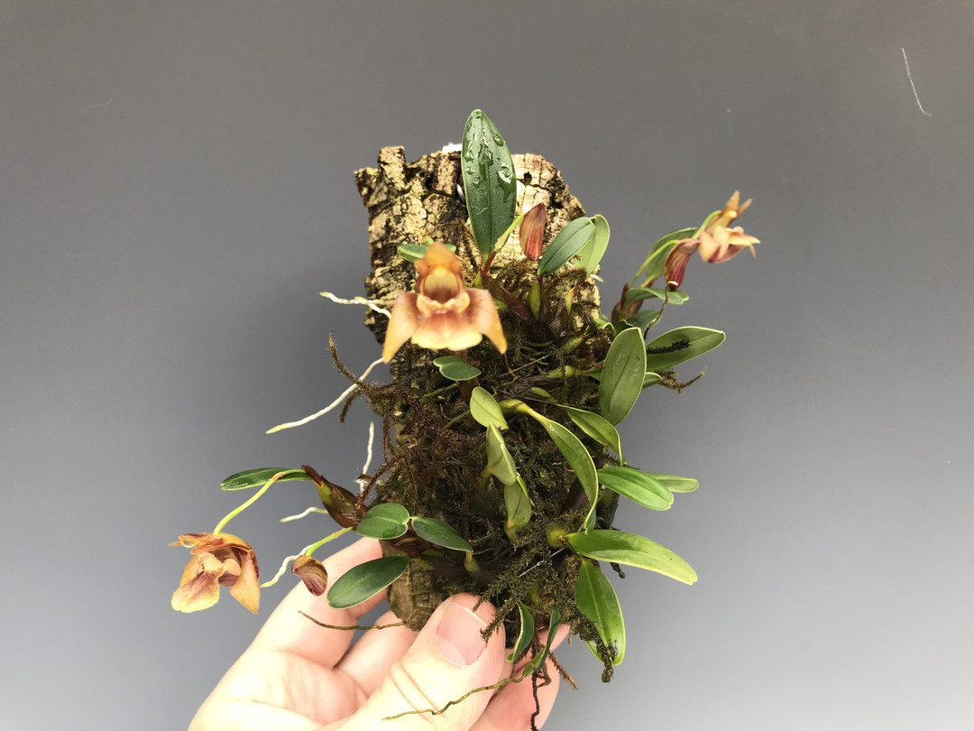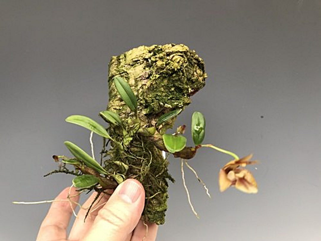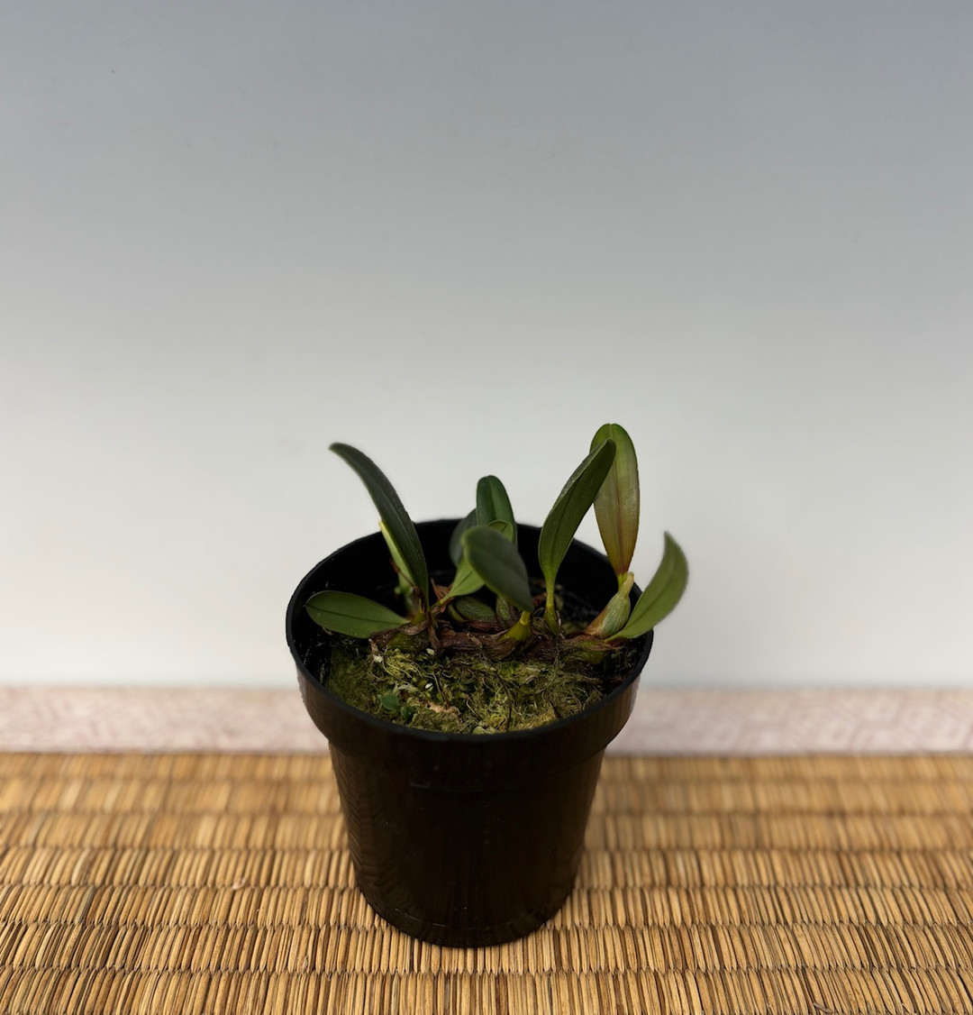 Native to North Vietnam, growing in cloud forests, this intriguing miniature species has a rambling growth habit similar to that of Diplocaulobiums and some Bulbophyllums. The flowers are proportionally large (1") compared to the growths and unique in their form, despite their unassuming coloration. This species is grown best mounted on cork slabs at intermediate temperatures but can be grown in cool to warm temps as well. This species is slightly fragrant. The plants currently available are all rooted divisions from our mother plant, offered in 3" pots.