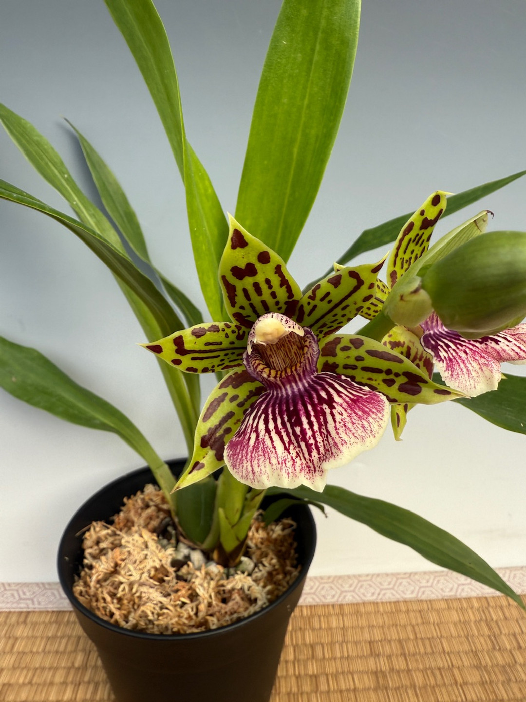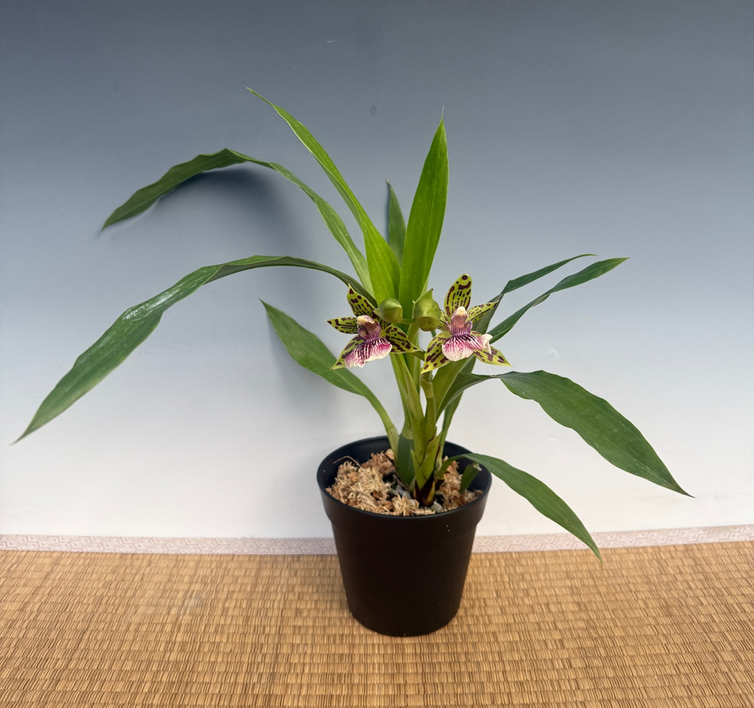 This Zygopetalum produces 20" tall growths and blooms with several 2" to 3" vibrantly colored flowers that last from 2 to 3 months! Grow in medium light and keep the potting medium moist, never letting it dry between watering. This hybrid is free-flowering and often blooms twice a year. The flowers are fragrant but not so sweet. They have more of a spicy scent to them.