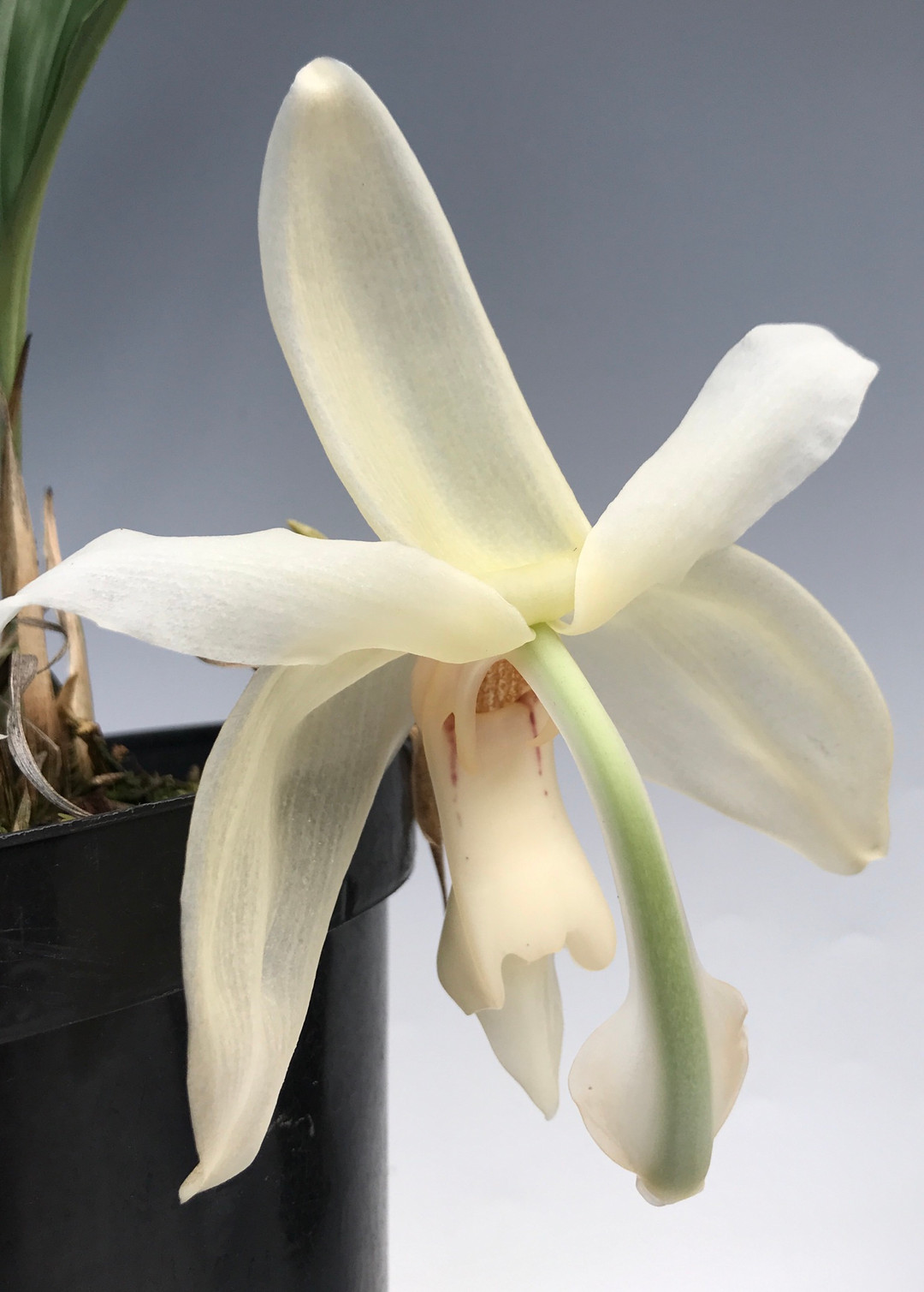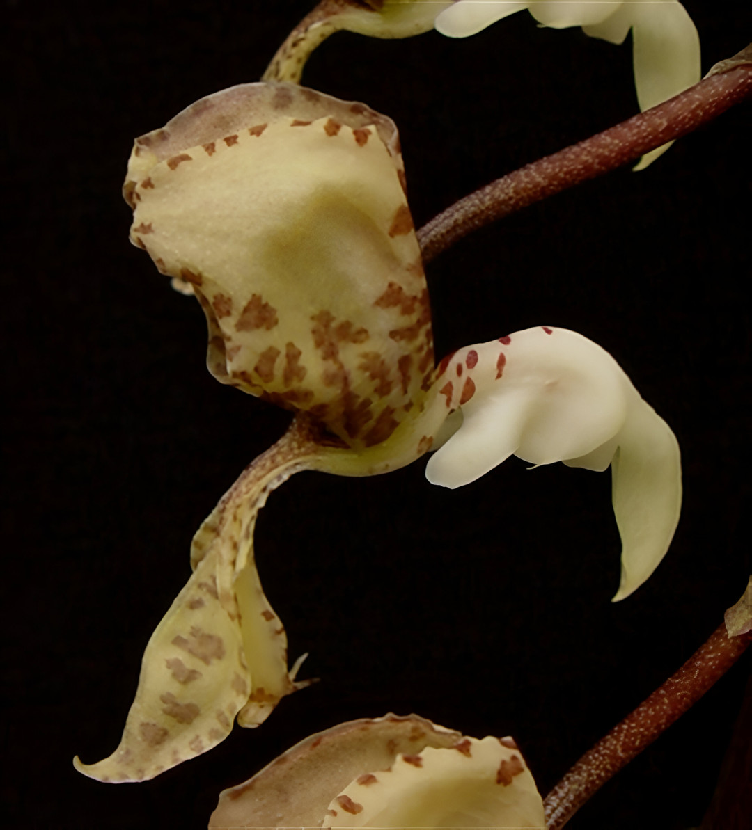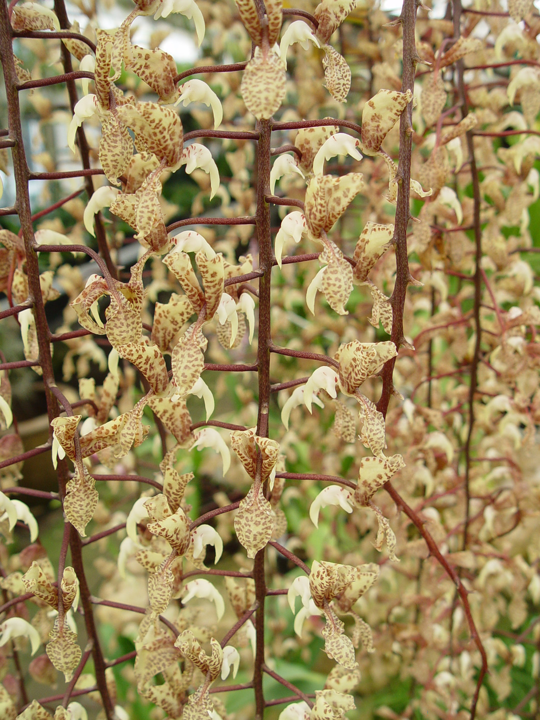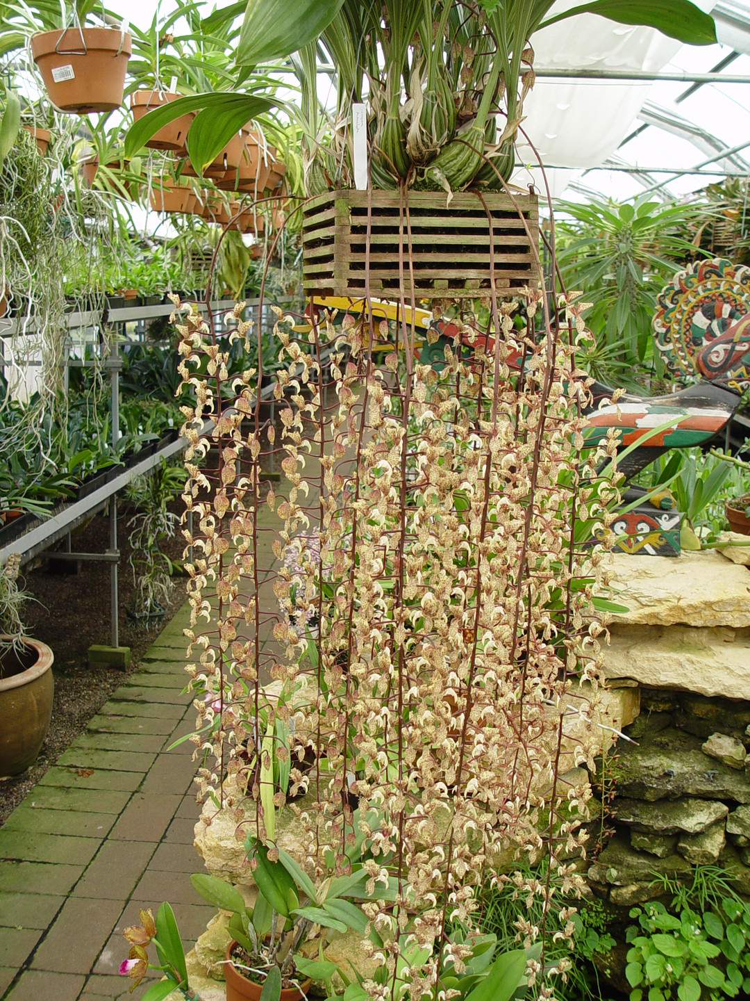 We are offering seedlings of this majestic epiphytic species native to Colombia, Ecuador, and Peru. The cascading stems of flowers look like birds in flight and have a pleasant fragrance. This Gongora creates the longest inflorescence of all the Gongora, reaching lengths of 4 feet! If grown well, in 4 to 5 years you could have a specimen as large as the example in our photo.