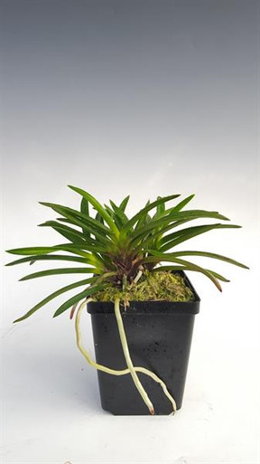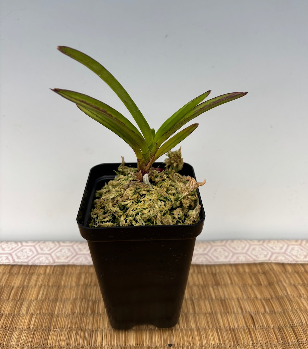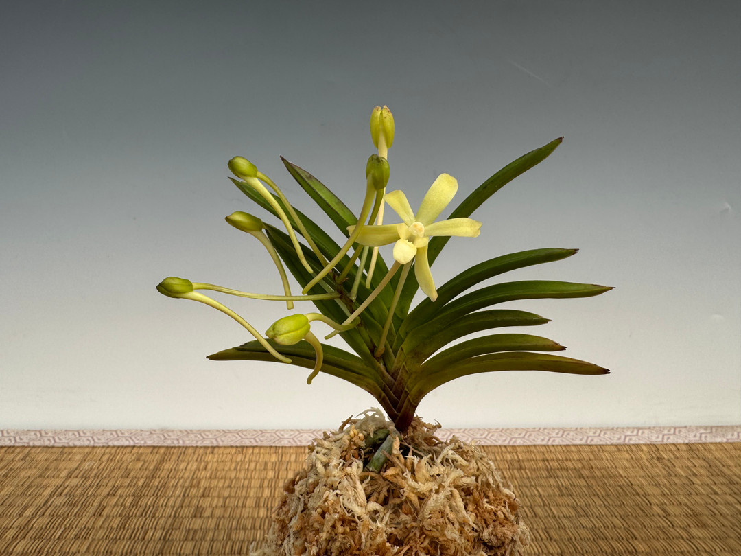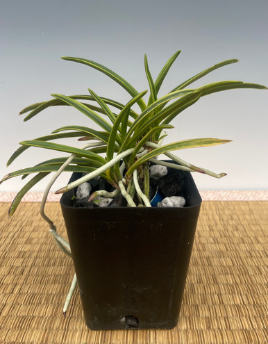 Kiryu, meaning 'Yellow Dragon', is a Neofinetia falcata hybrid hybrid brought over from Japan about ten years ago. While the exact parentage is unknown, it has well arranged leaves and has large green/yellow flowers. The pictured plant in the last photo is the exact one for sale.