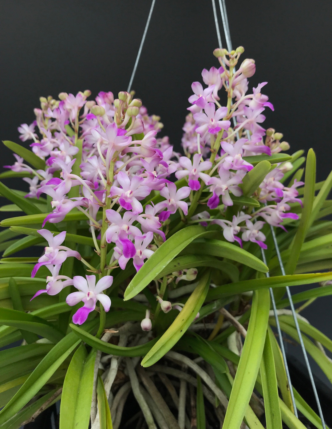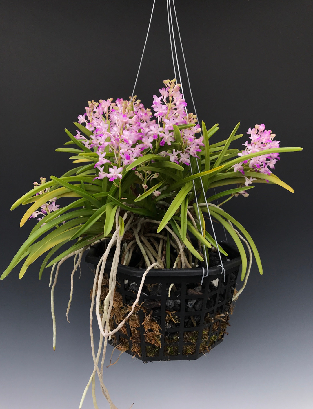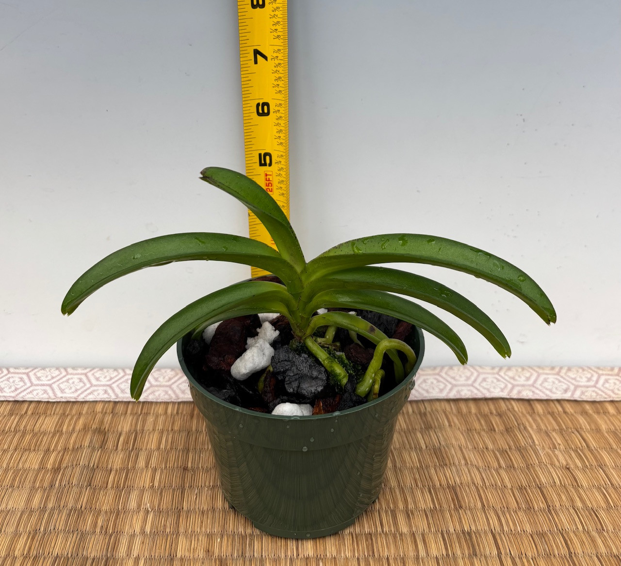 This hybrid backcross results in 75% Rhyncostylis coelestis and 25% Neofinetia falcata genetics, producing an intermediate-sized orchid that readily puts out side growths and blooms on highly floriferous, medium-length spikes. When in bloom, the flowers emit a sweet, floral fragrance. Pictured is a large multi-growth specimen plant, followed by an example of the 4" pot size single-growth plants we are currently offering.