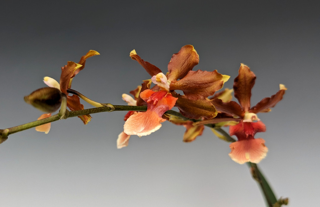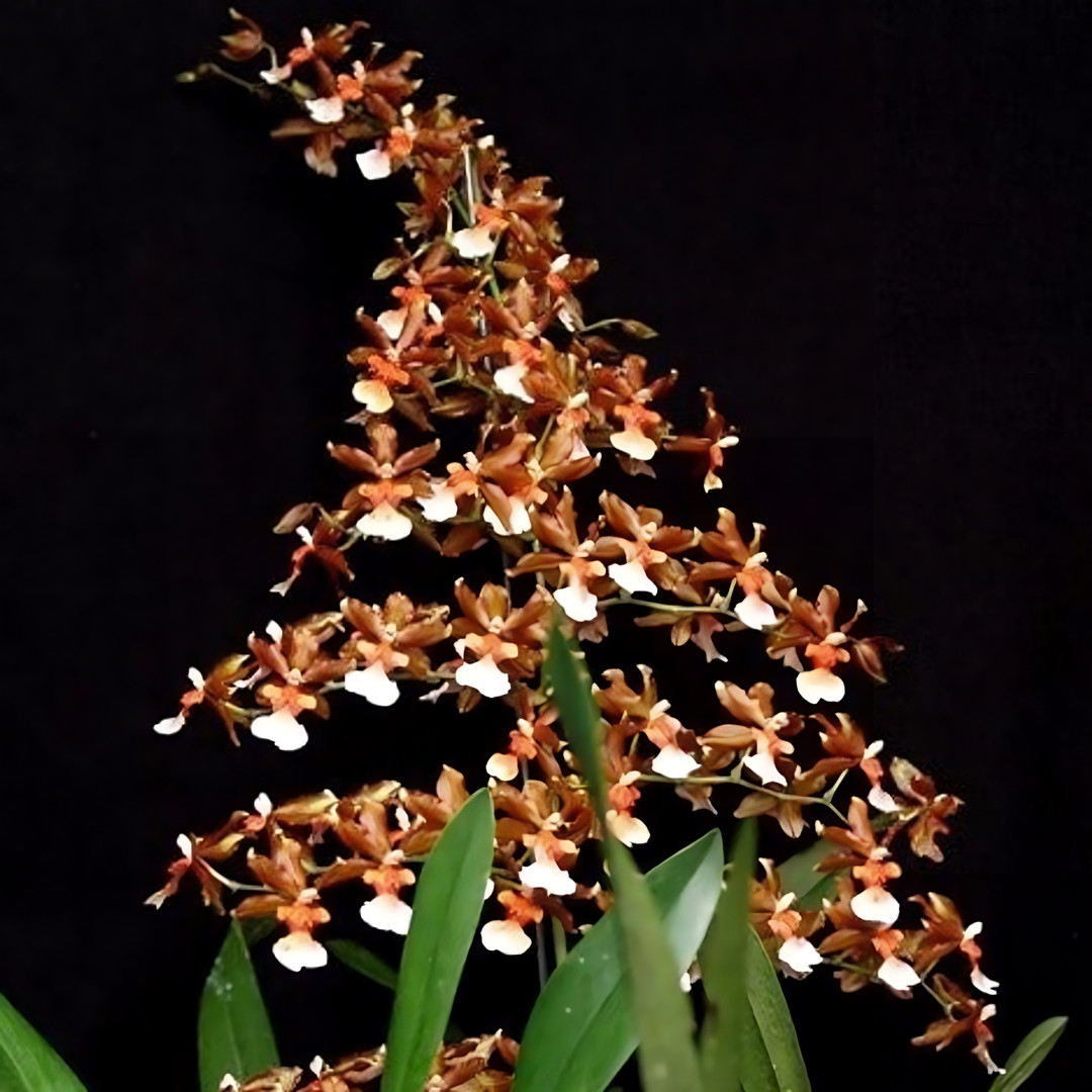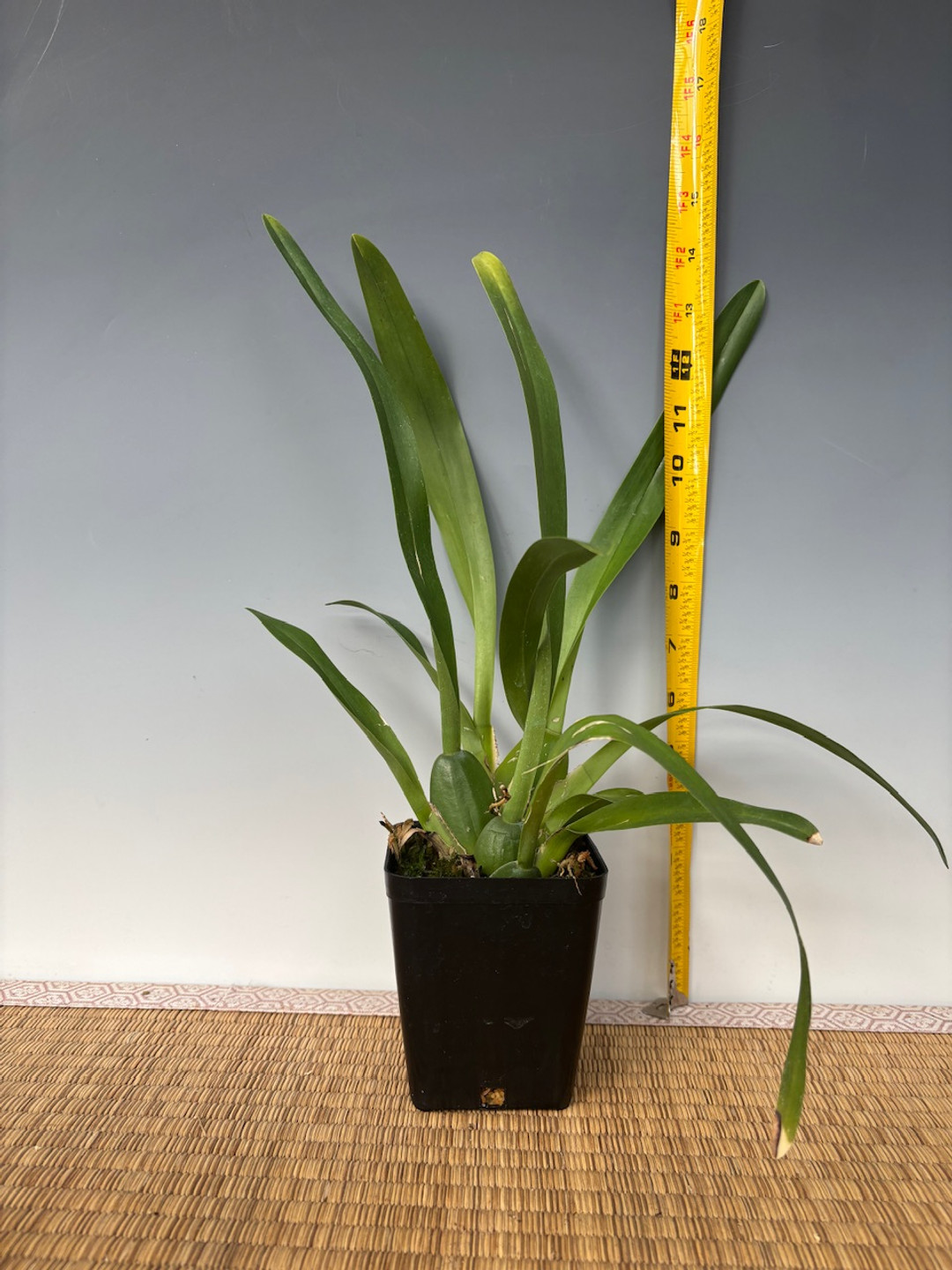 An Oncidium hybrid that has just reached blooming size. The first two photos represent the current size of the plants as of January 2025. Flower spikes reach between 24 and 30 inches high.