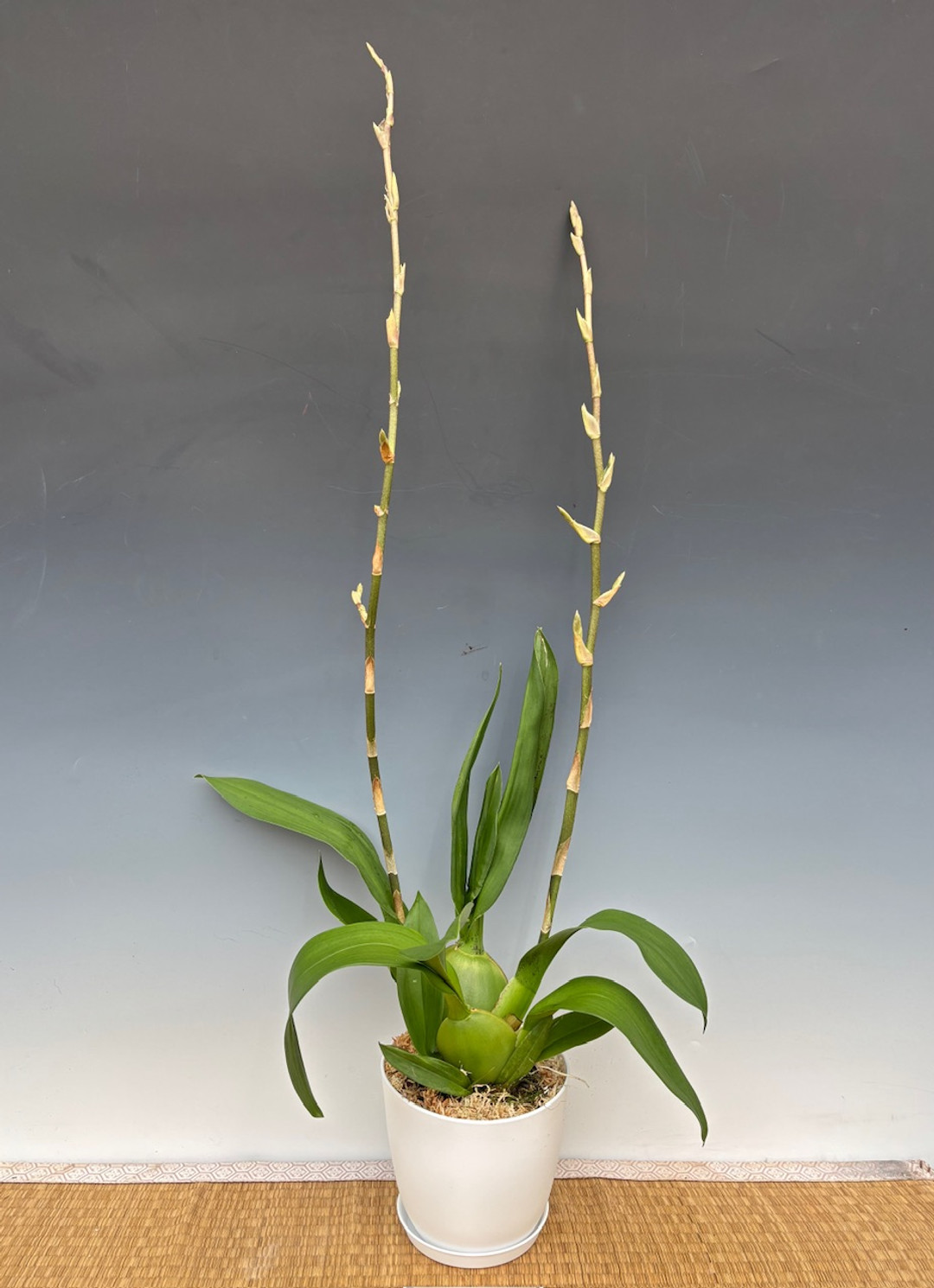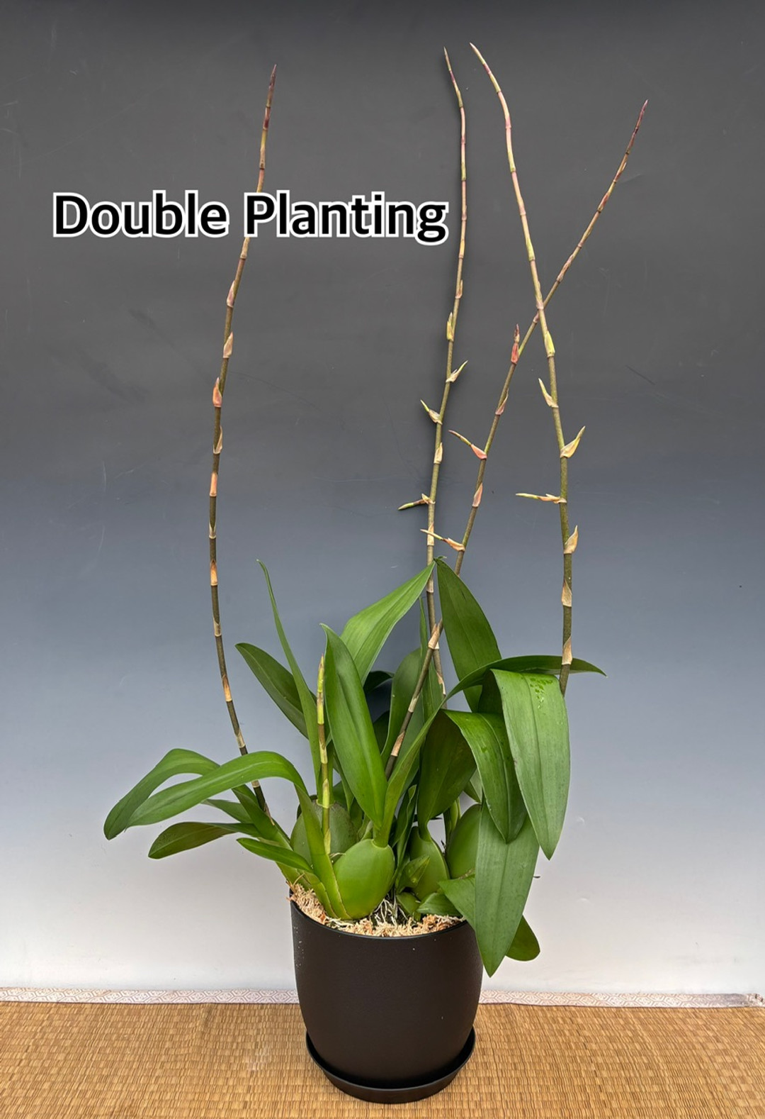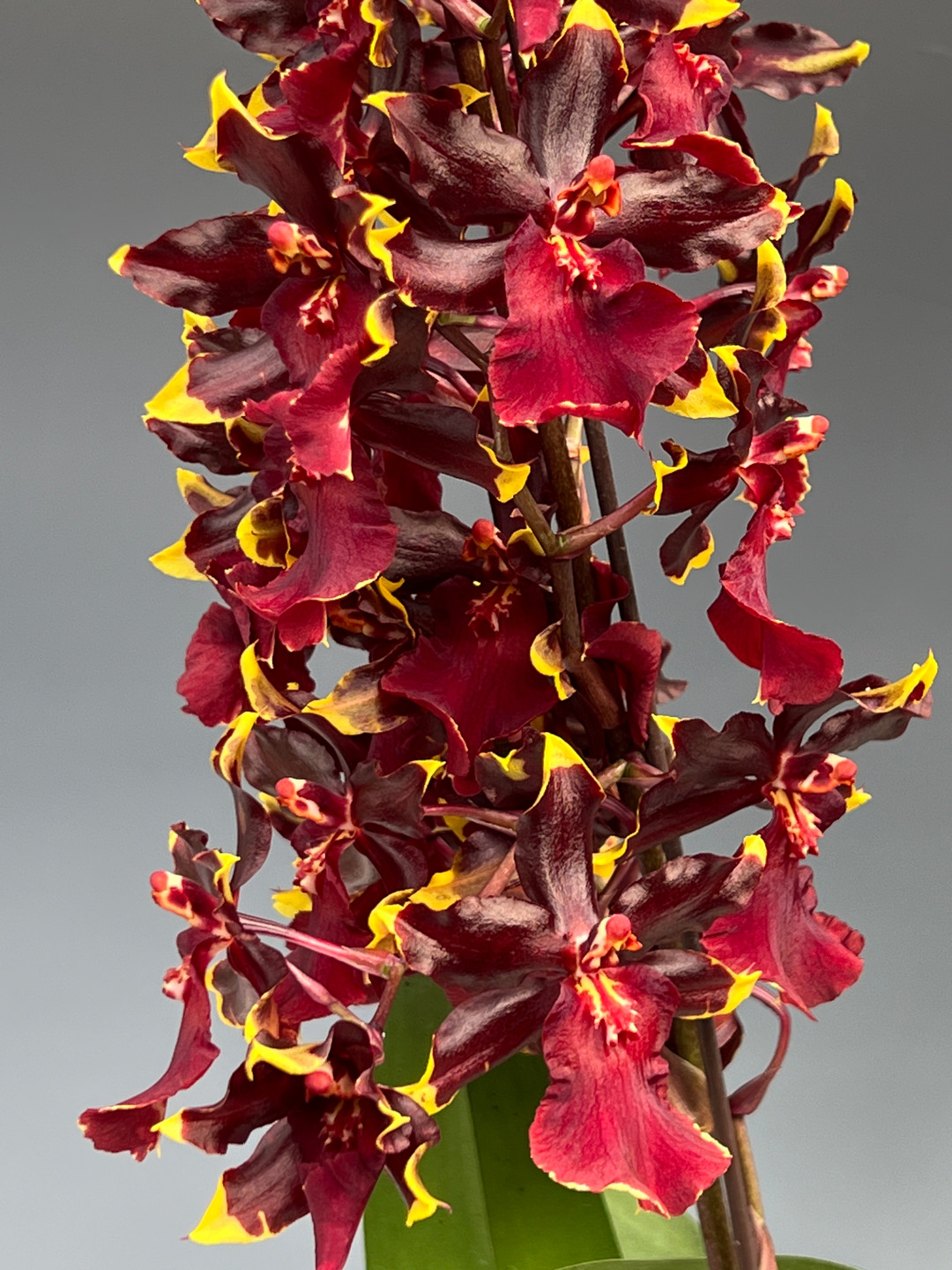 This beloved intergeneric clone blooms with a multitude of dark red flowers accented by yellow tips that last up to 2 months. The flower spikes can reach over 40" tall from the base of the pot to the top of the spike. There can be well over 50 flowers per flower spike! The rotund pseudobulbs with their wide leaves have a pleasing appearance.