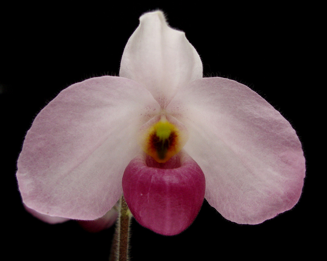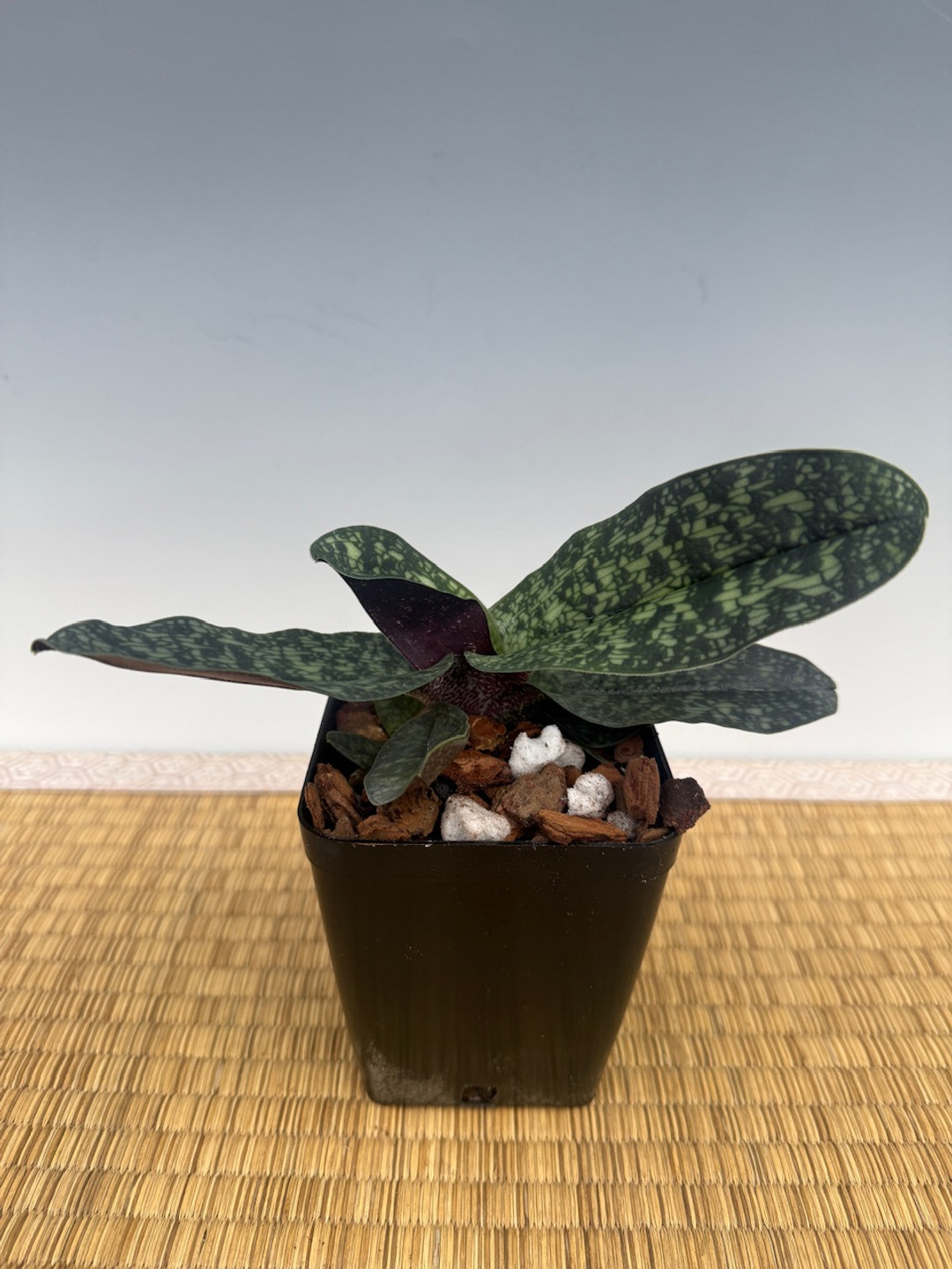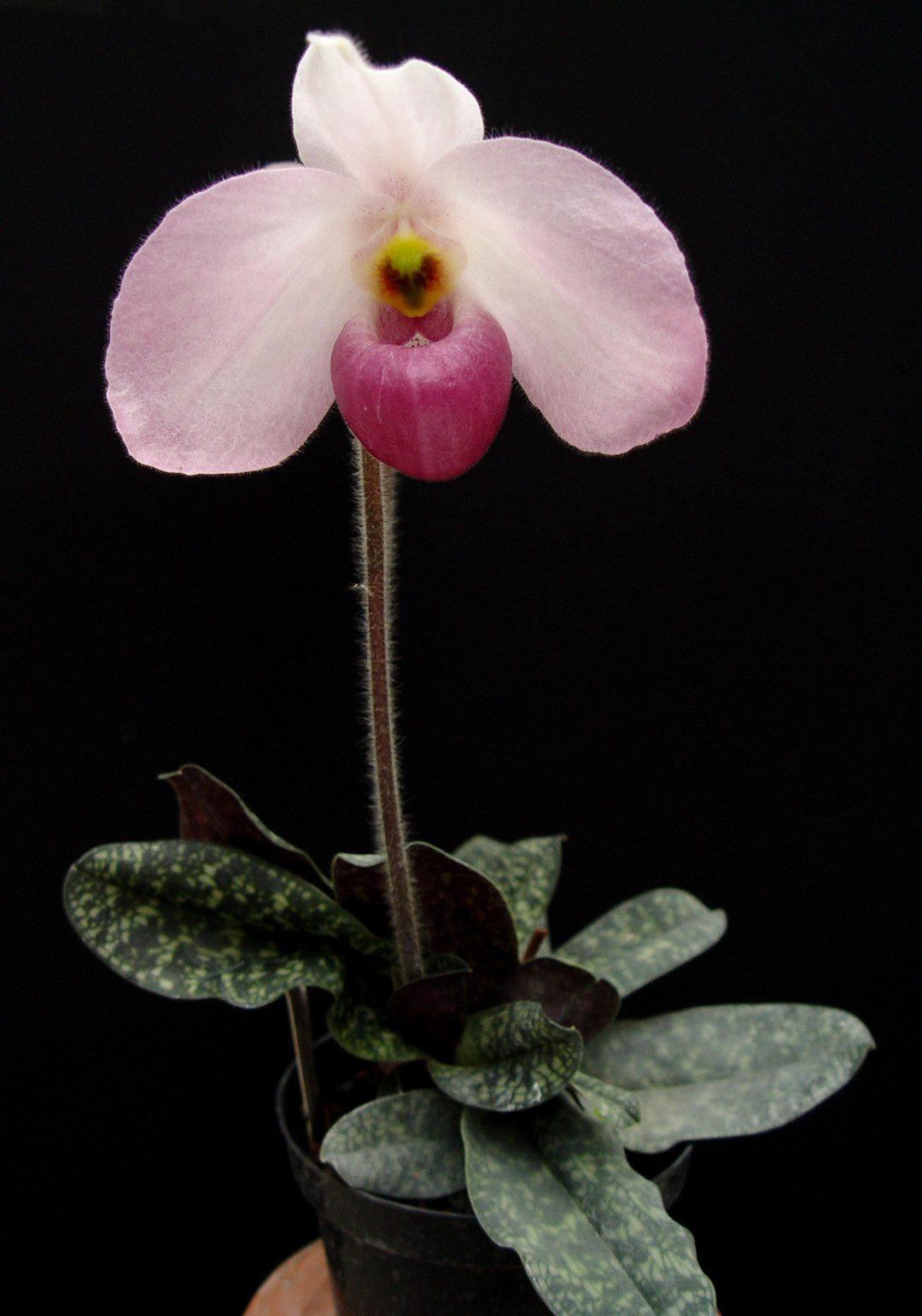 A beautiful primary parvisepalum hybrid. Both parents of this cross are native to Vietnam. These types are easy to grow and grow well in semi-shade to shade with even moisture at the root systems. Flowers have a slight fragrance of roses. They grow well in both bark and sphagnum moss. These are big and showy flowers that are somewhat short-lived at about 2 to 3 weeks. The foliage is equally as beautiful as the flowers with tessellation.