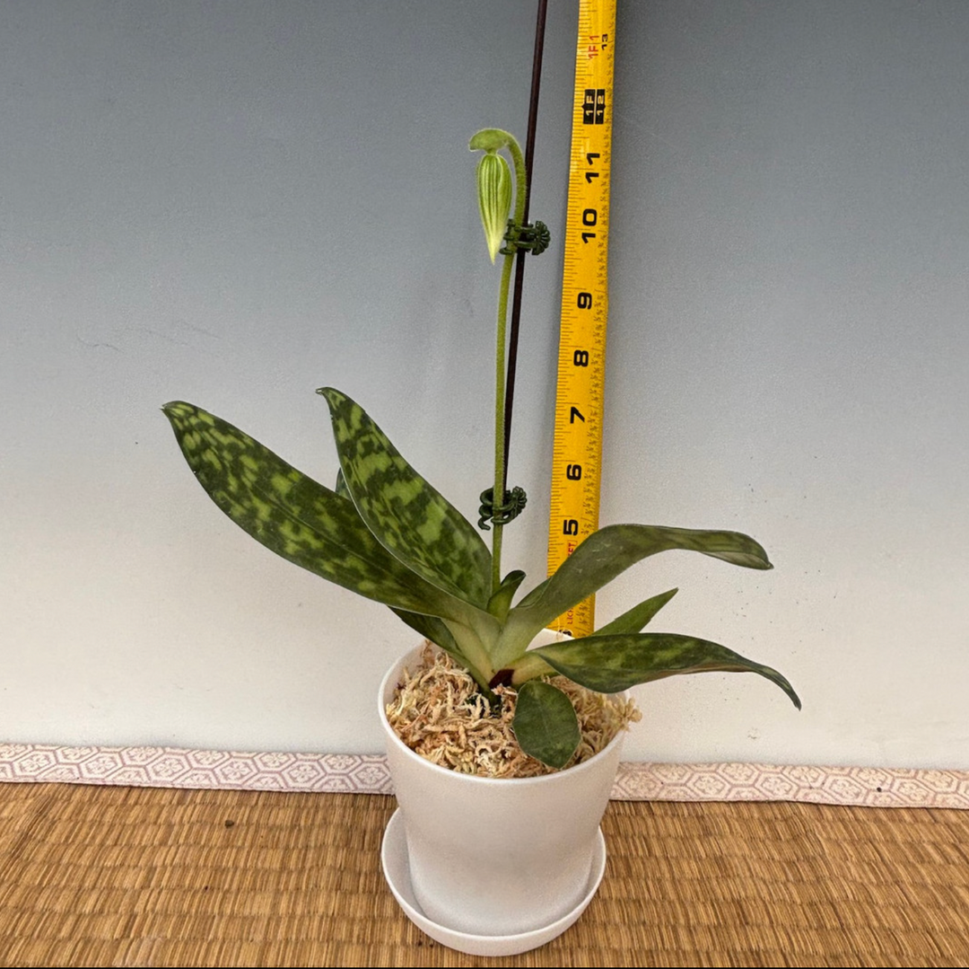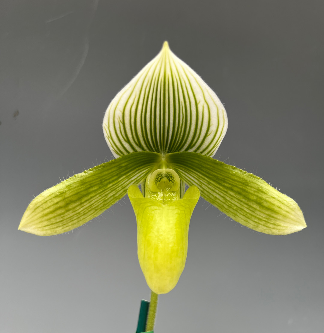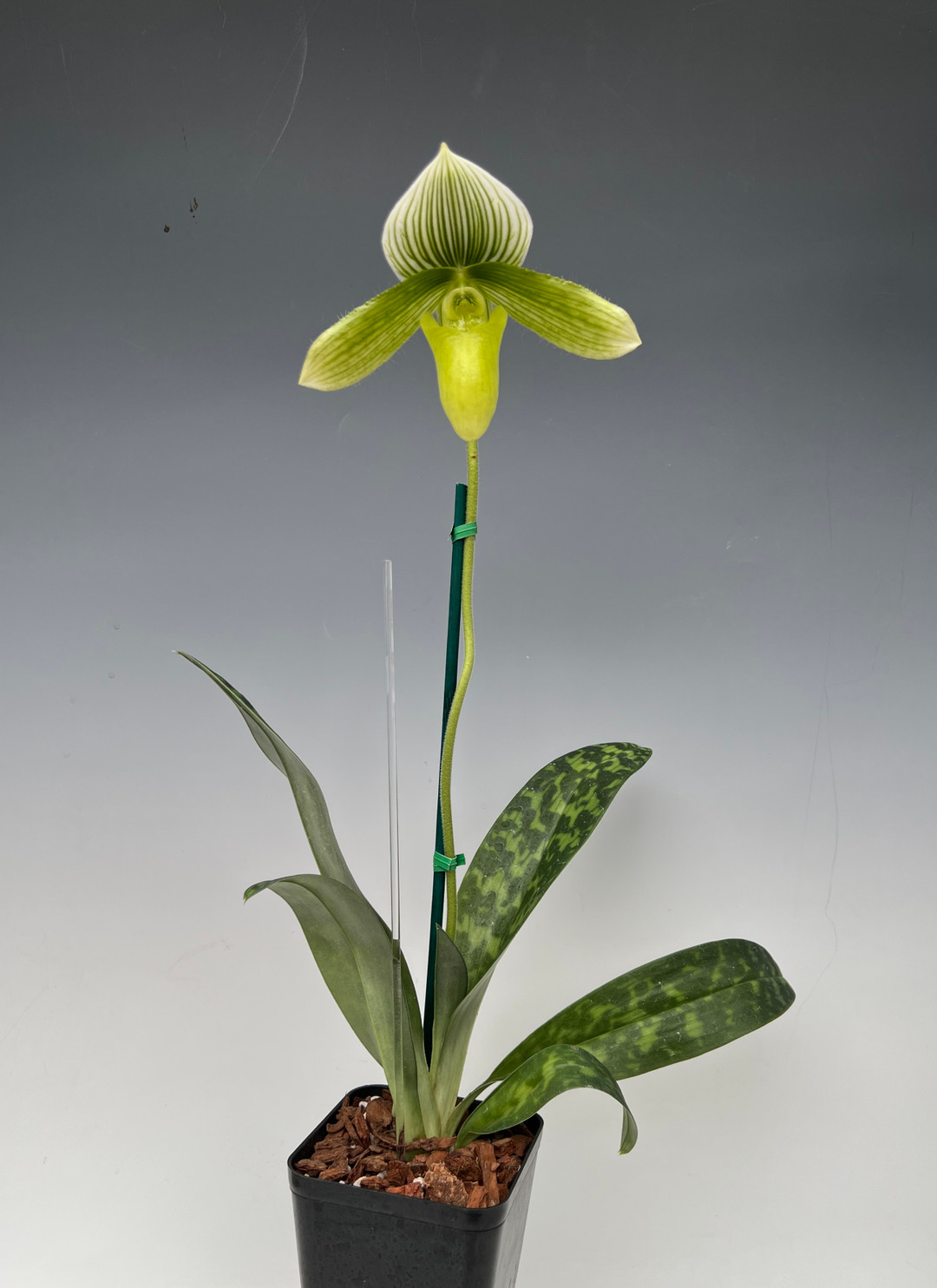 This hybrid has four species ancestors, with a dominant influence by Paph. callosum and Paph. lawrenceanum from the Maudiae parent, as well as an intermediate influence of Paph. superbiens and a minor presence of Paph. sukhakulii genetics. This version of the hybrid was created using all albo-verde (green and white) parents. Even when not in bloom, the foliage is quite beautiful with its mottled green patterns. These plants can flower twice per year and the flowers typically last 2+ months.