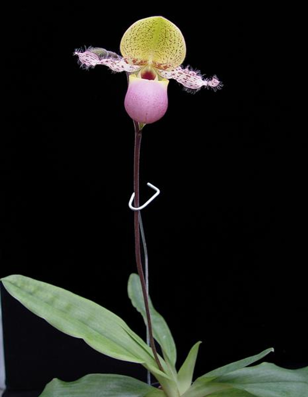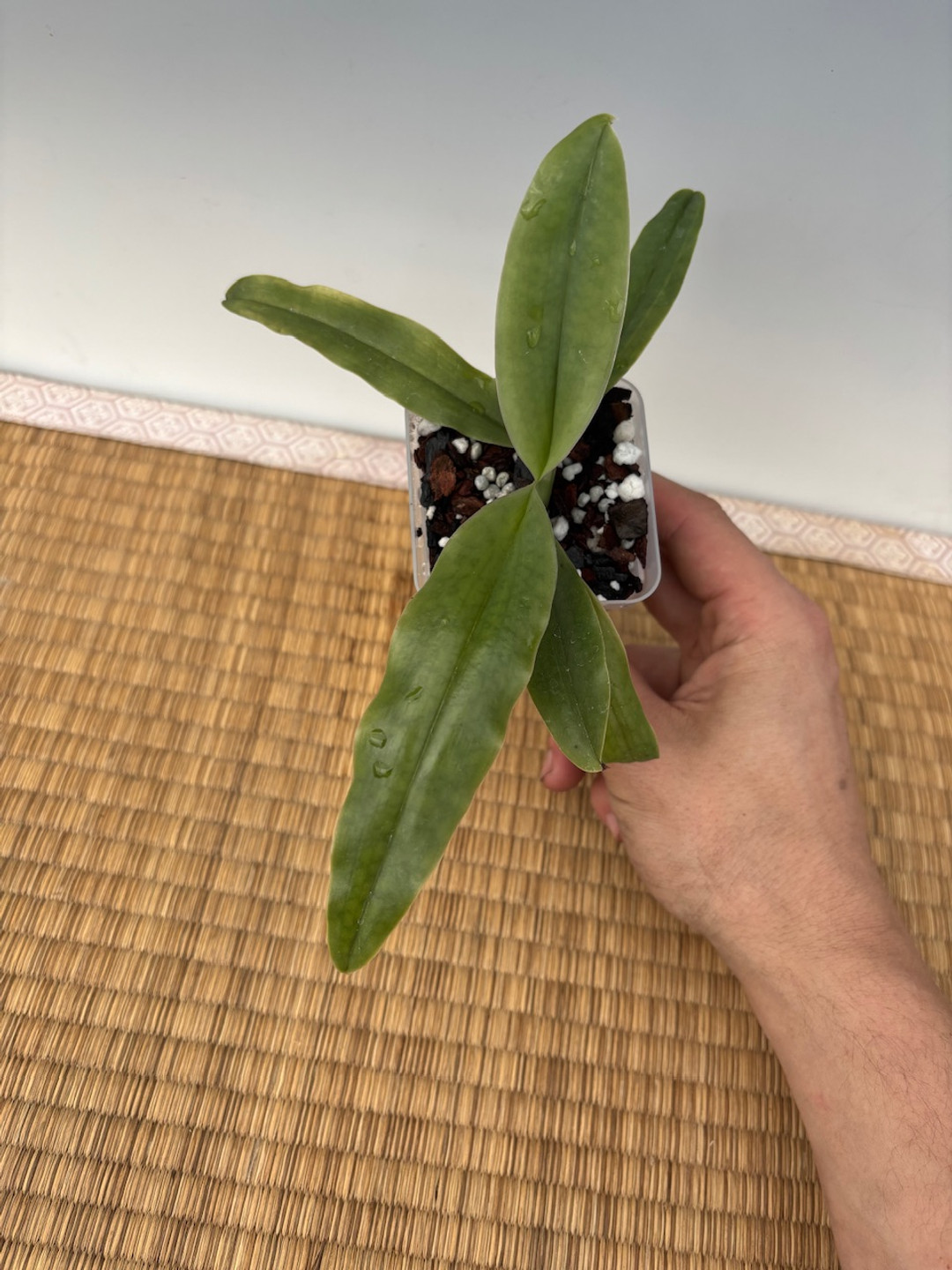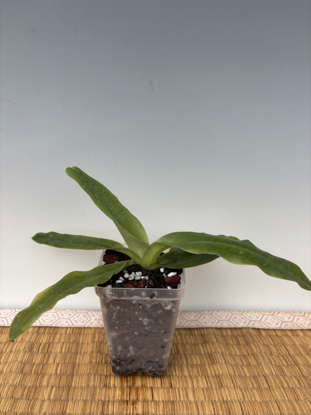 A fantastic species from southwest java that is found growing on limestone cliffs in shady conditions. This is from section Cochlopetalum, which is a series of species that repeatedly flower on the same spike several times over, often up to a year or more! Paph. moquettianum is also special in that it is the largest flower of all the Cochlopetalum species. In addition, this particular batch of 'Mochi' x self is very unique as the parent plant was purchased from a collector in Japan, and has the largest flowers ever recorded at 12 cm across! Don't miss this opportunity! This batch is near blooming size and should be blooming by the summer of 2026.
