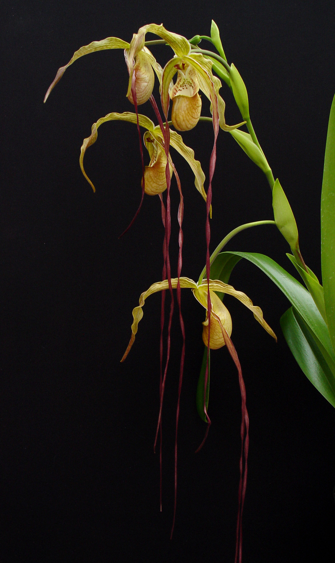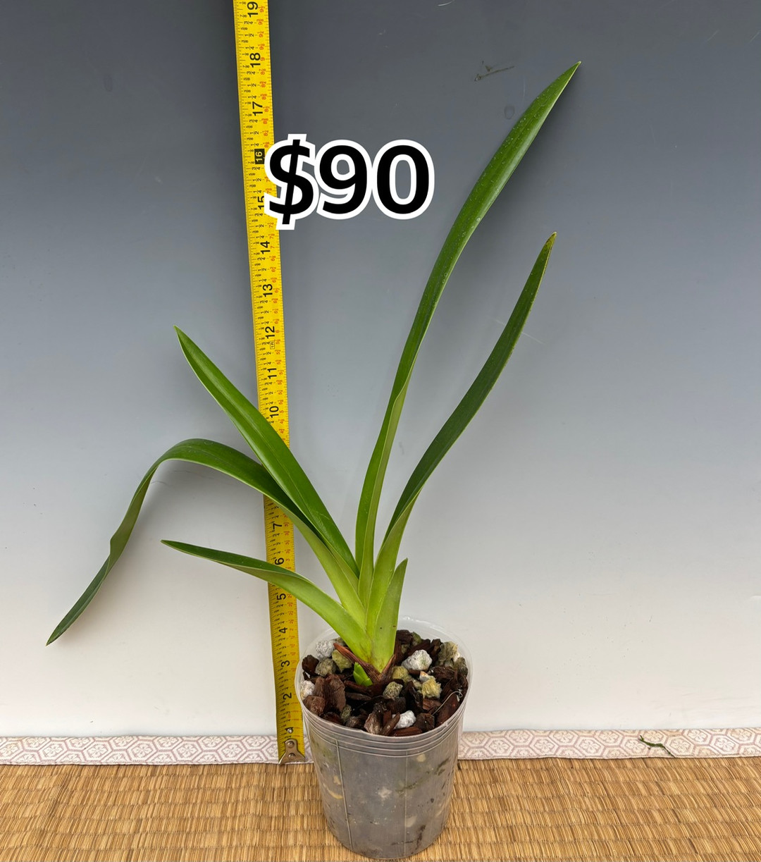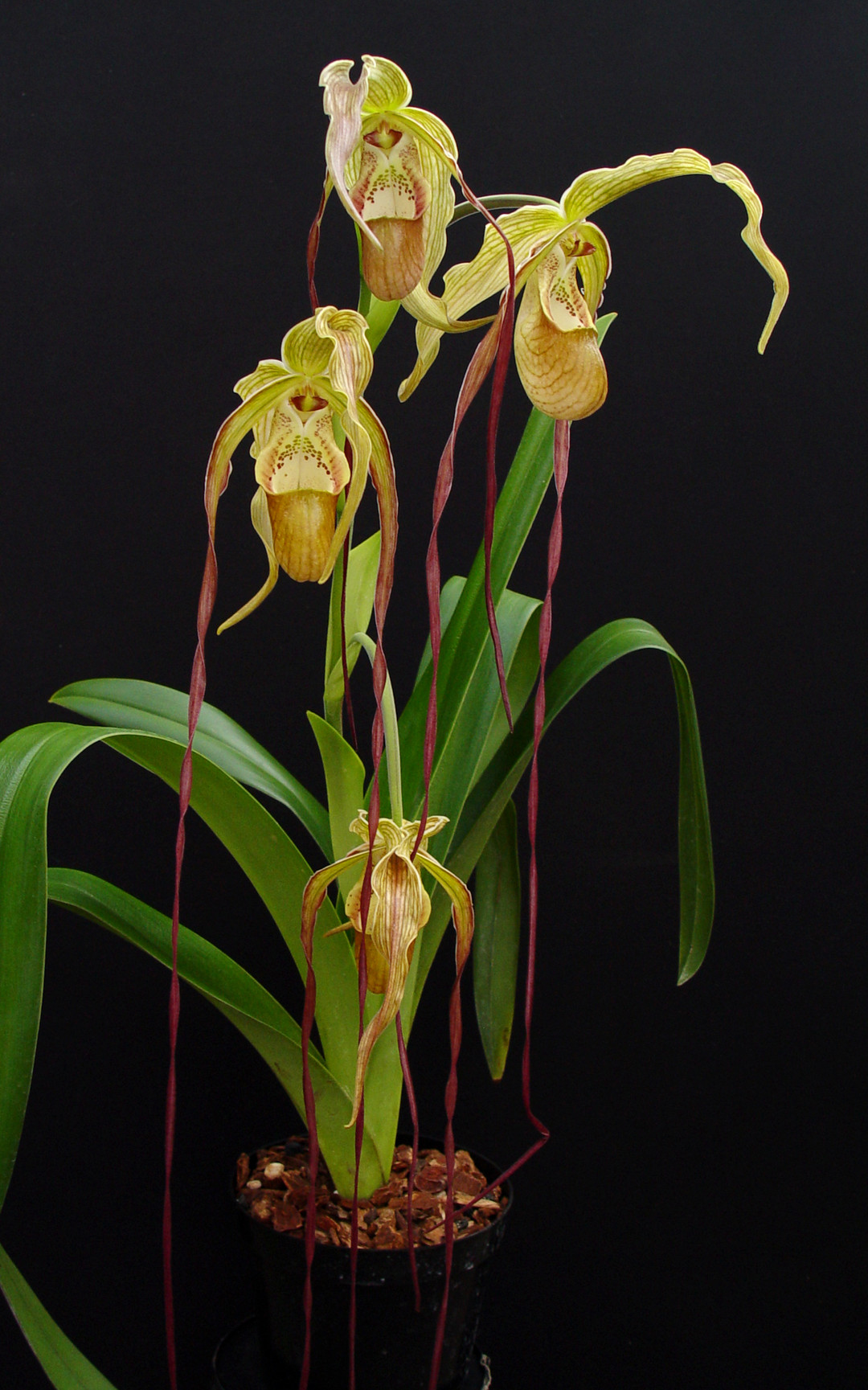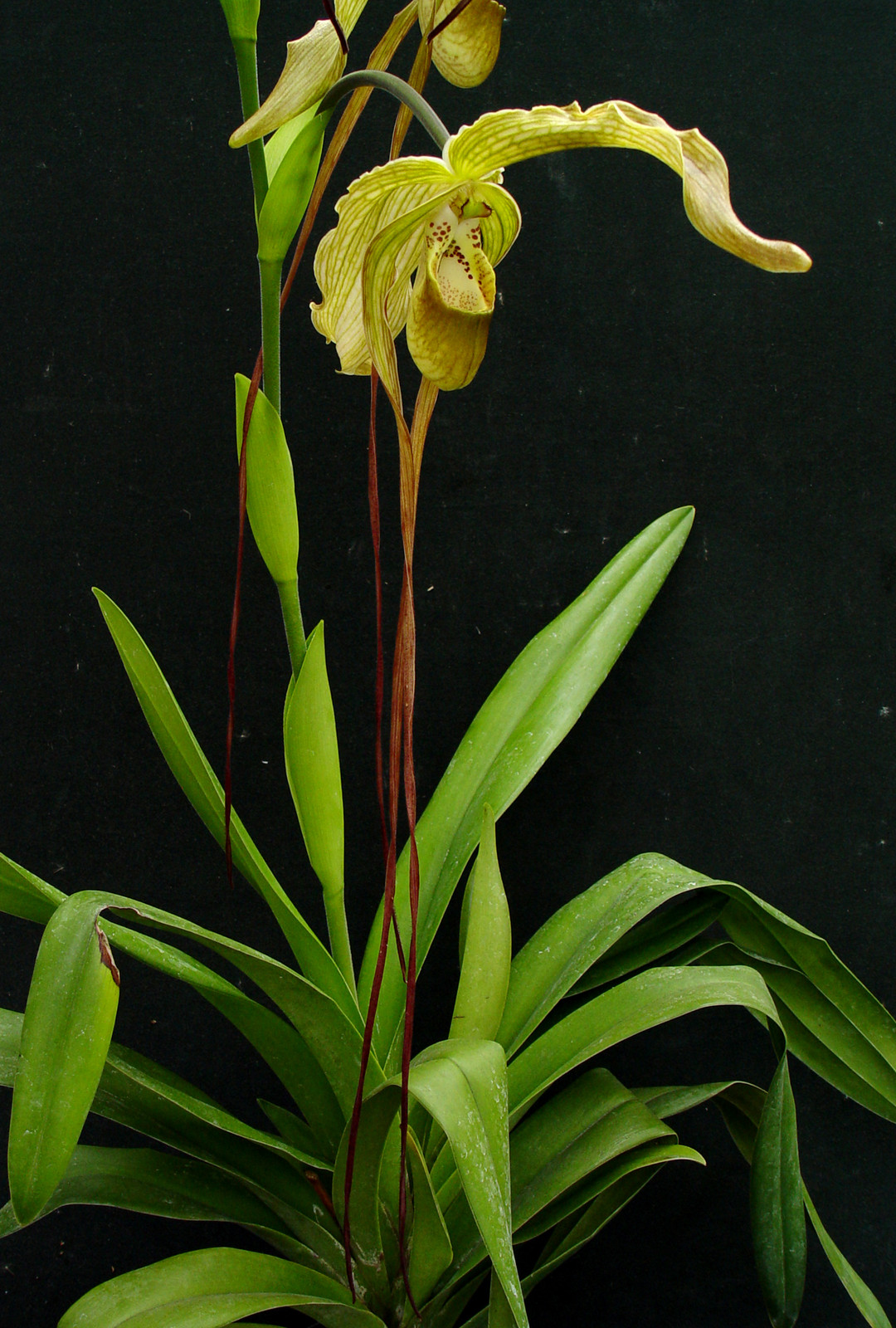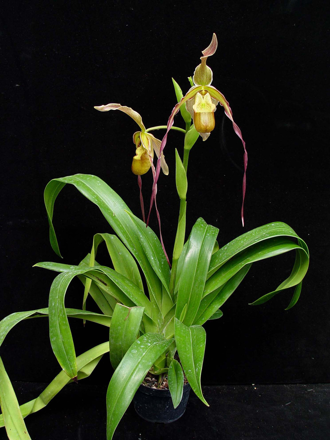 This fantastic primary hybrid blooms with intermediate to long petal length with colors that range from yellow-green to orange and red. This is a large-growing Phragmipedium hybrid that is a strong, vigorous orchid thanks to the easy-to-grow Phrag. longifolium influence! The plants shown in the last photos are the exact ones you will receive. They are divisions from this past winter and have just begun developing new roots. Only the $90 plant is blooming size!